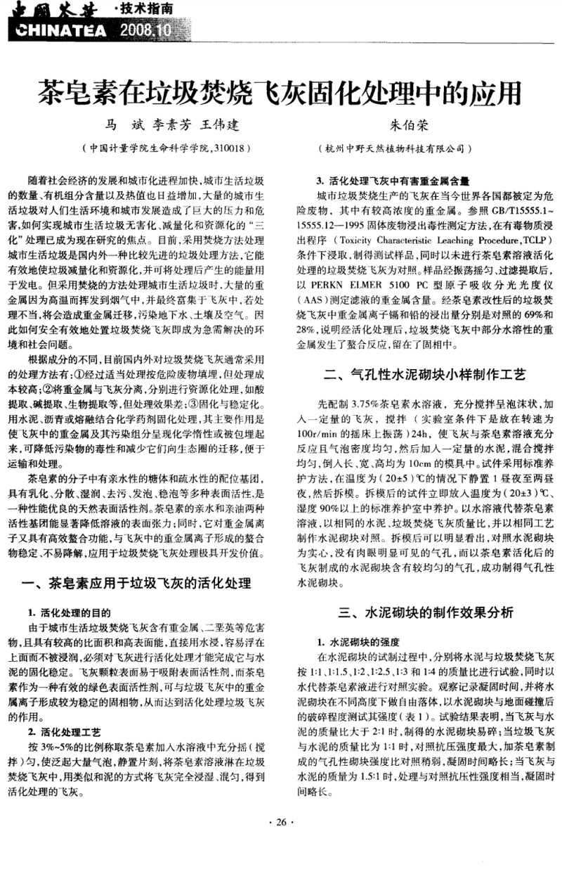 茶皂素在垃圾焚燒飛灰固化處理中的應(yīng)用